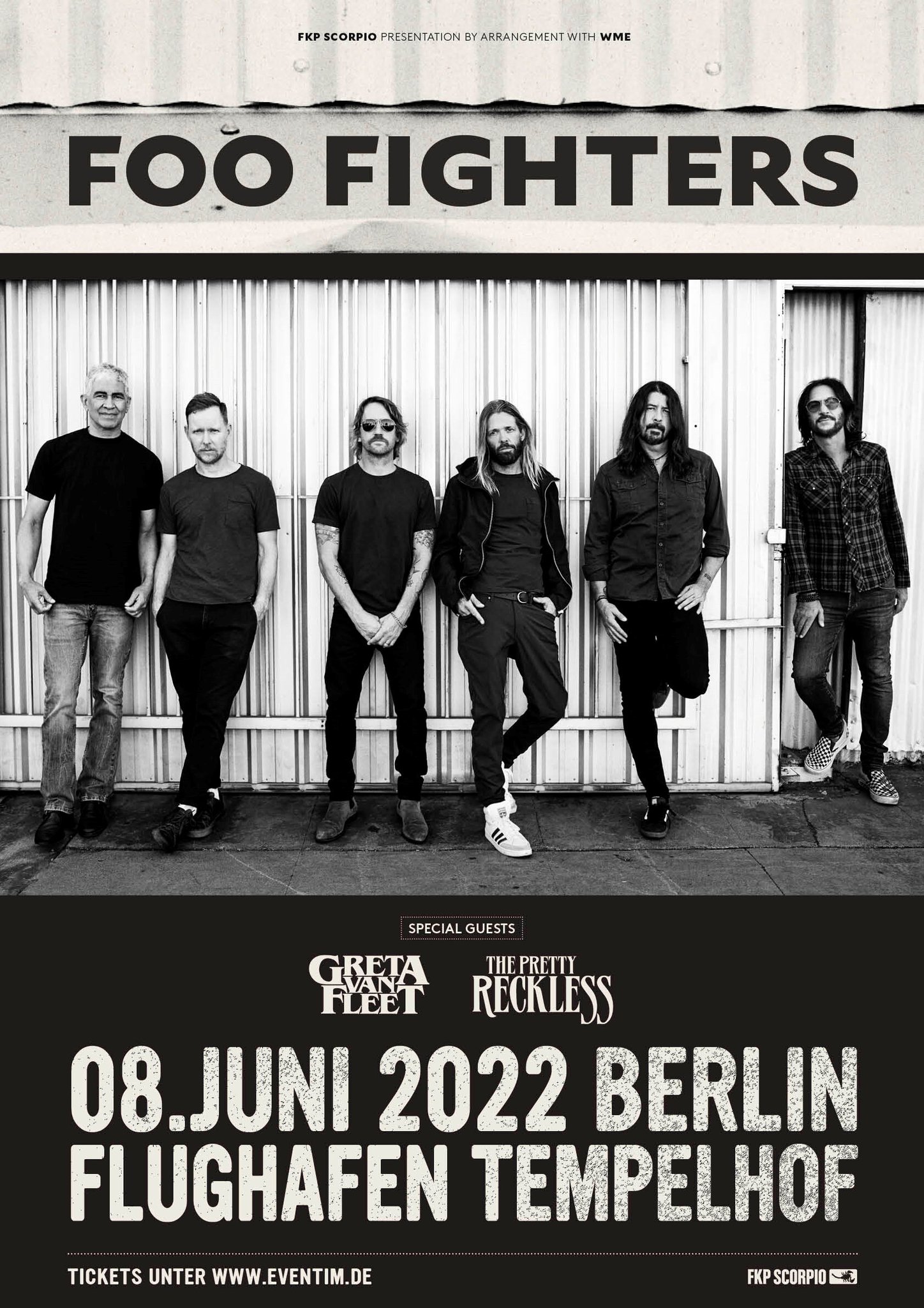 Tue Dec 7 2021 730 PM See Tickets. Foo Fighters - Tour 2022 - 08062022 - Berlin - Berlin - Germany - Event Information - TICKETS - LINEUP - Foo Fighters Greta Van Fleet The Pretty Reckless. The Foos return to the UK next June and July for a huge stadium tour with stops in Manchester Birmingham and London.